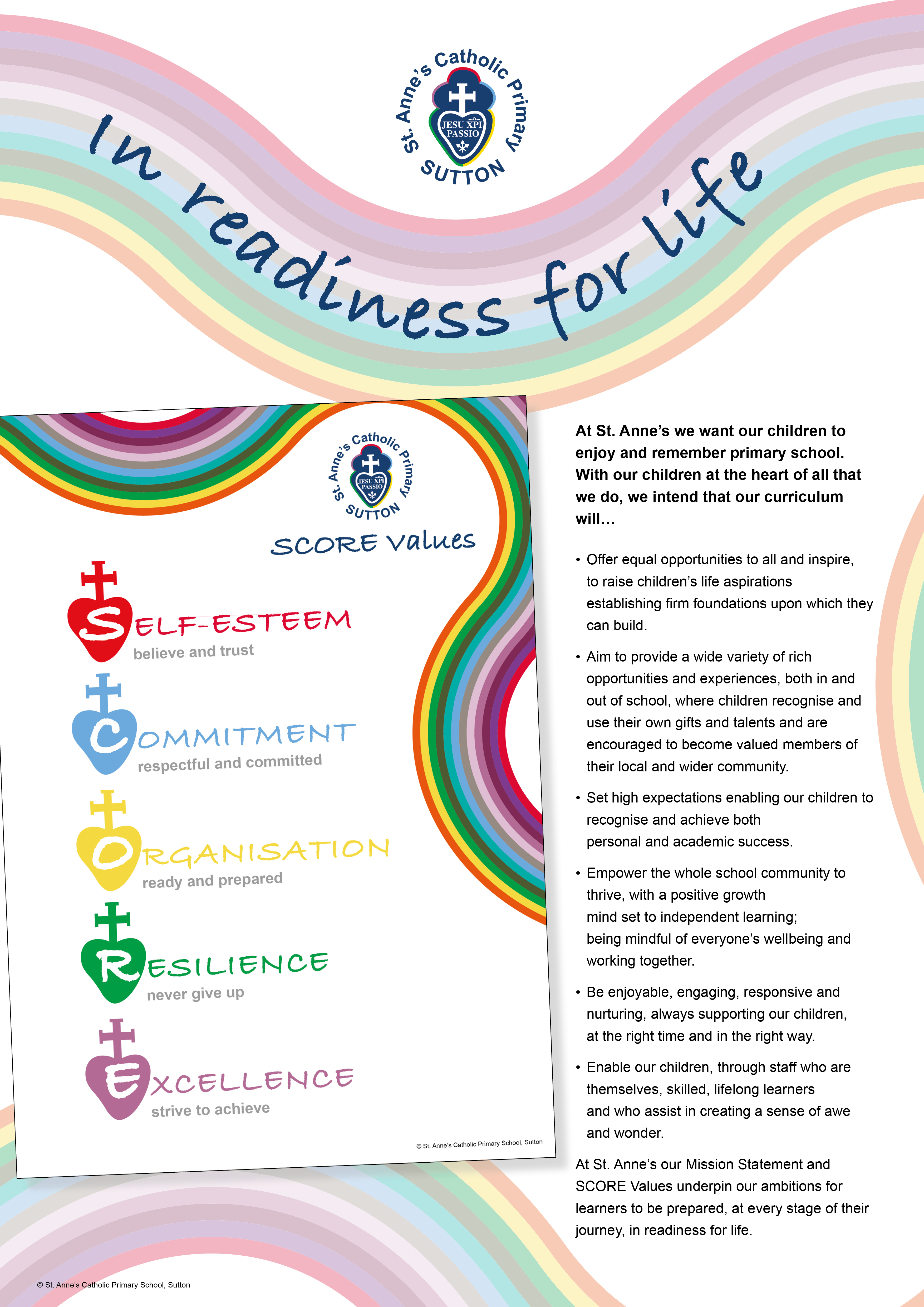 As a Catholic School, we firmly believe in educating ‘the whole child’ and so alongside the statutory curriculum subjects we also work with every pupil to enable them to SCORE, achieving their hopes dreams and ambitions in readiness for life.